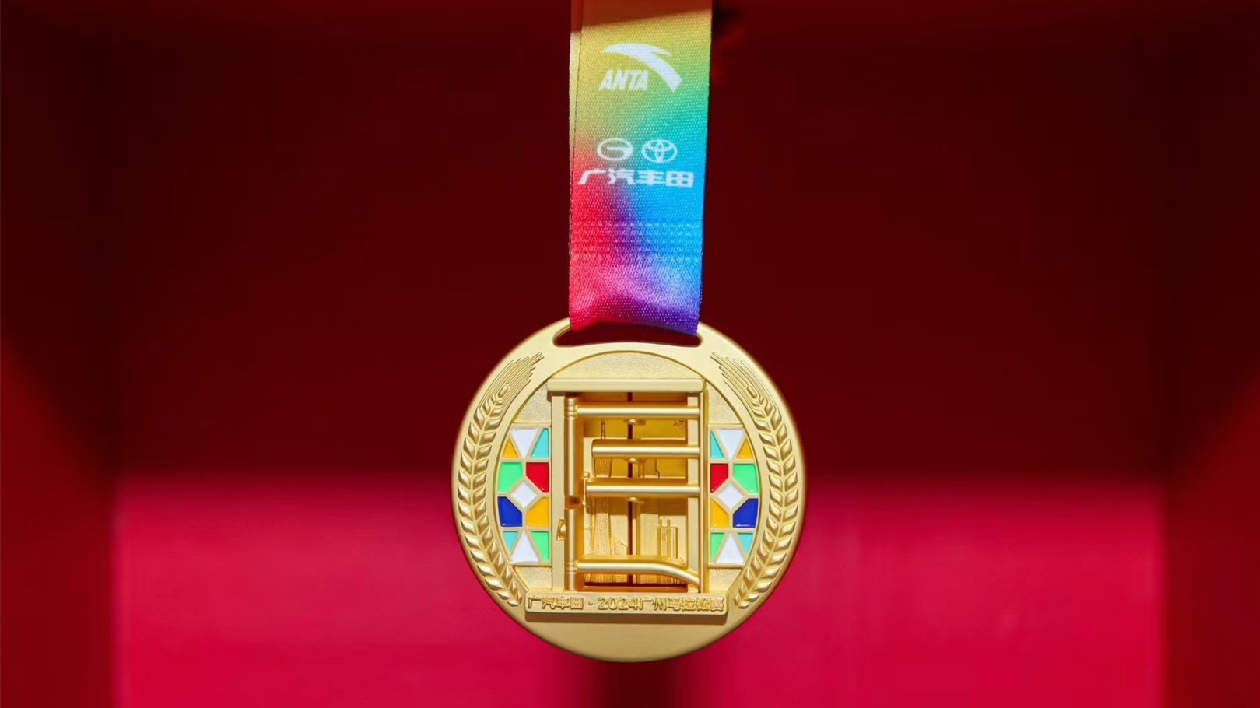 2024年廣馬完賽獎牌整體設計別出心裁,巧妙地融入了廣州西關大屋元素,其中趟櫳門的設計不僅承載着西關老街的記憶,也體現了廣州城市的歷史風貌。「廣州」二字與趟櫳門整體的結構精妙契合、渾然一體,透過趟櫳門,隱約可見廣州城市地標建築群,寓意着傳統文化與現代繁華之間的完美交融。