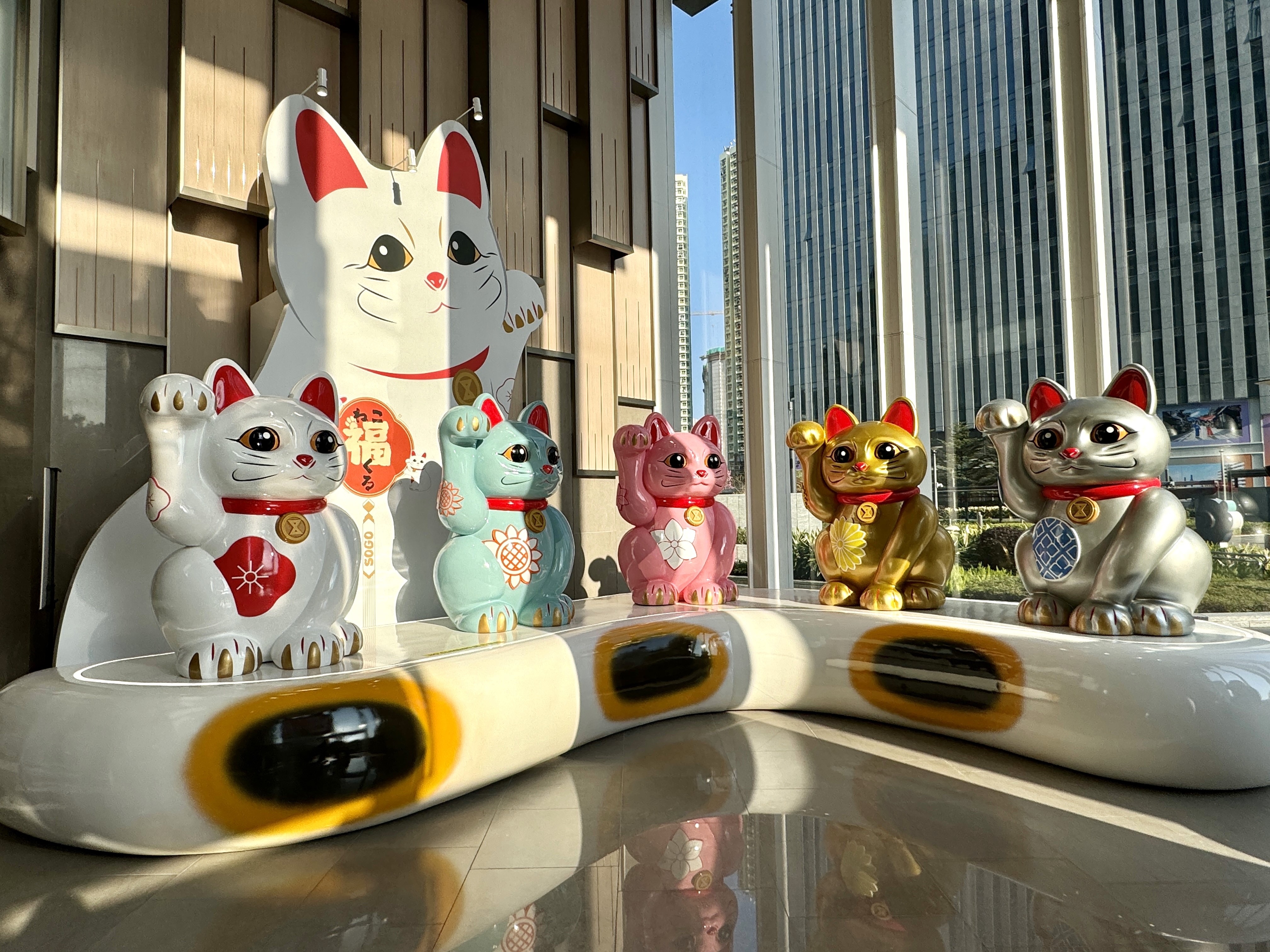 崇光啟德店正門設有高達4.5米的巨型招財貓,旁邊圍繞6隻1.5米高的立體招福貓,每隻貓咪的顏色各具寓意,分別搭配百貨的花朵圖案。