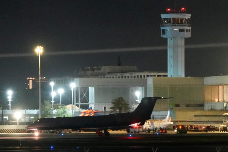 3月11日在菲律賓馬尼拉比利亞莫爾空軍基地拍攝的載有菲律賓前總統杜特爾特的飛機。圖源 新華社