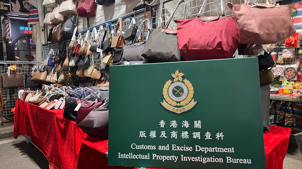 海關早前巡查期間發現旺角有固定小販攤檔售賣懷疑冒牌物品,經調查後,海關人員當天採取執法行動,掃蕩九個位於通菜街的固定小販攤檔,以及附近一間樓上冒牌物品貯存倉庫,檢獲一批懷疑冒牌物品,包括手袋、衣服和首飾。行動中,海關拘捕一名52歲女子及一名65歲的男子。案件仍在調查中。