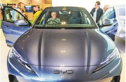 圖:4月17日,在倫敦舉行的英國家庭能源及電動汽車展覽會上,人們在比亞迪展台參觀電動汽車。 (新華)