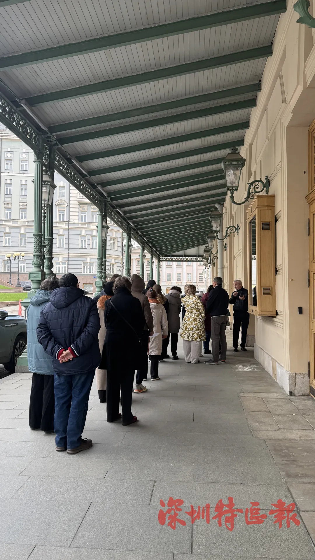 當地時間4月26日,莫斯科氣溫驟降,觀眾們熱情不減,頂着寒風,早早來到莫斯科大劇院外,排隊有序入場。