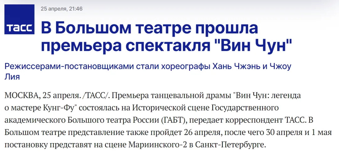 喀山文化報報道稱:「這是首次有中國原創舞劇團登上俄羅斯『雙一流』藝術殿堂的舞台,也是兩國建交75周年之際中俄文化交流的重要標誌性事件。即使你此前對《詠春》一無所知,也會被他們的優美舞蹈所吸引。」