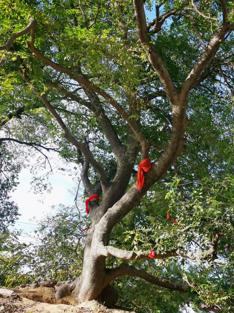 再走近點仔細觀察,葉子有點像槐樹,但也不全像。據當地人介紹,這棵樹和普通槐樹的生長規律也沒什麼太大的差別,春天發芽,夏天開花,秋天結果,冬天落葉。這棵樹雖然高大粗壯,但樹幹和樹枝歪七扭八,沒有一根是直的,除了觀賞,似乎沒有什麼實用價值。我想起二千多年前莊子也說過一棵樹,正因為樹幹沒用才得以長久,如果有用的話恐怕早就被砍掉蓋房子或者做家具了。