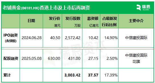 老鋪黃金(6181)於5月8日公告,擬配售431萬股新H股,占已發行H股及已發行股份總數的約3.19%及2.56%,每股配售價630港元,折讓約8.03%。中信建投(23.730, 0.03, 0.13%)國際、花旗,為此次配股融資的整體協調人及配售代理。預計配售所得款項總額為27.15億港元,淨額為26.98億元。截至發稿,其每股報689港元,較IPO發行價40.5港元大漲17倍,目前市值約1160億港元。