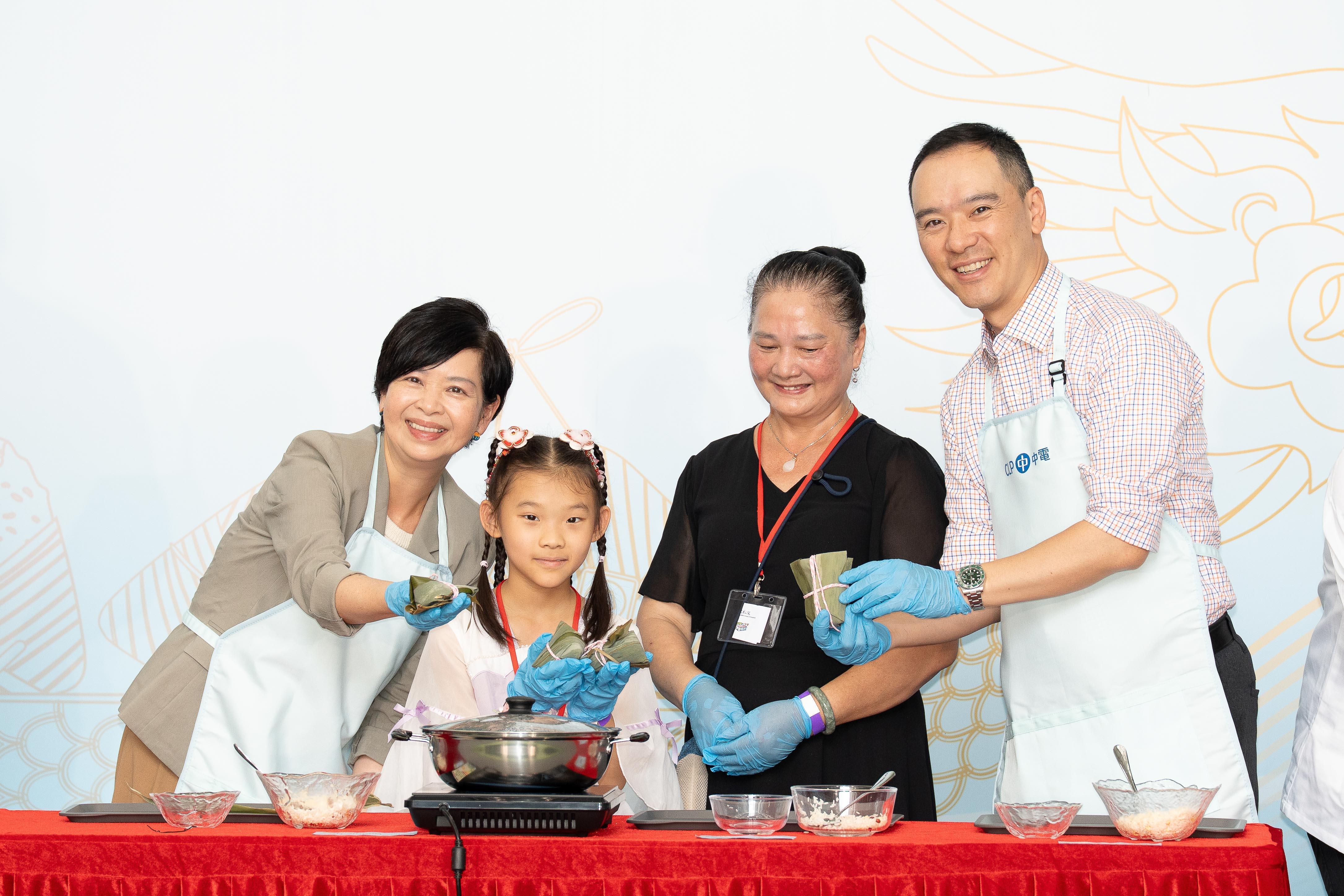 房屋局局長何永賢(左一)和中華電力總裁羅嘉進(右一)與受惠家庭即場包糭,共迎端午佳節。