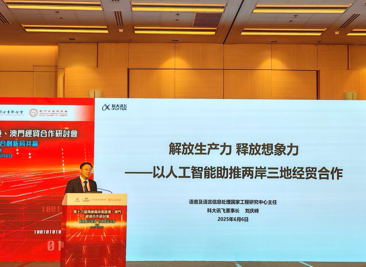 語音及語言信息處理國家工程研究中心主任、科大訊飛董事長劉慶峰應邀出席並發表主旨演講,圍繞「解放生產力 釋放想象力——以人工智能助推海峽兩岸暨香港、澳門經貿合作」主題,分享科大訊飛在AI核心技術突破、產業應用落地、生態體系建設和港澳台戰略布局等方面的最新進展。