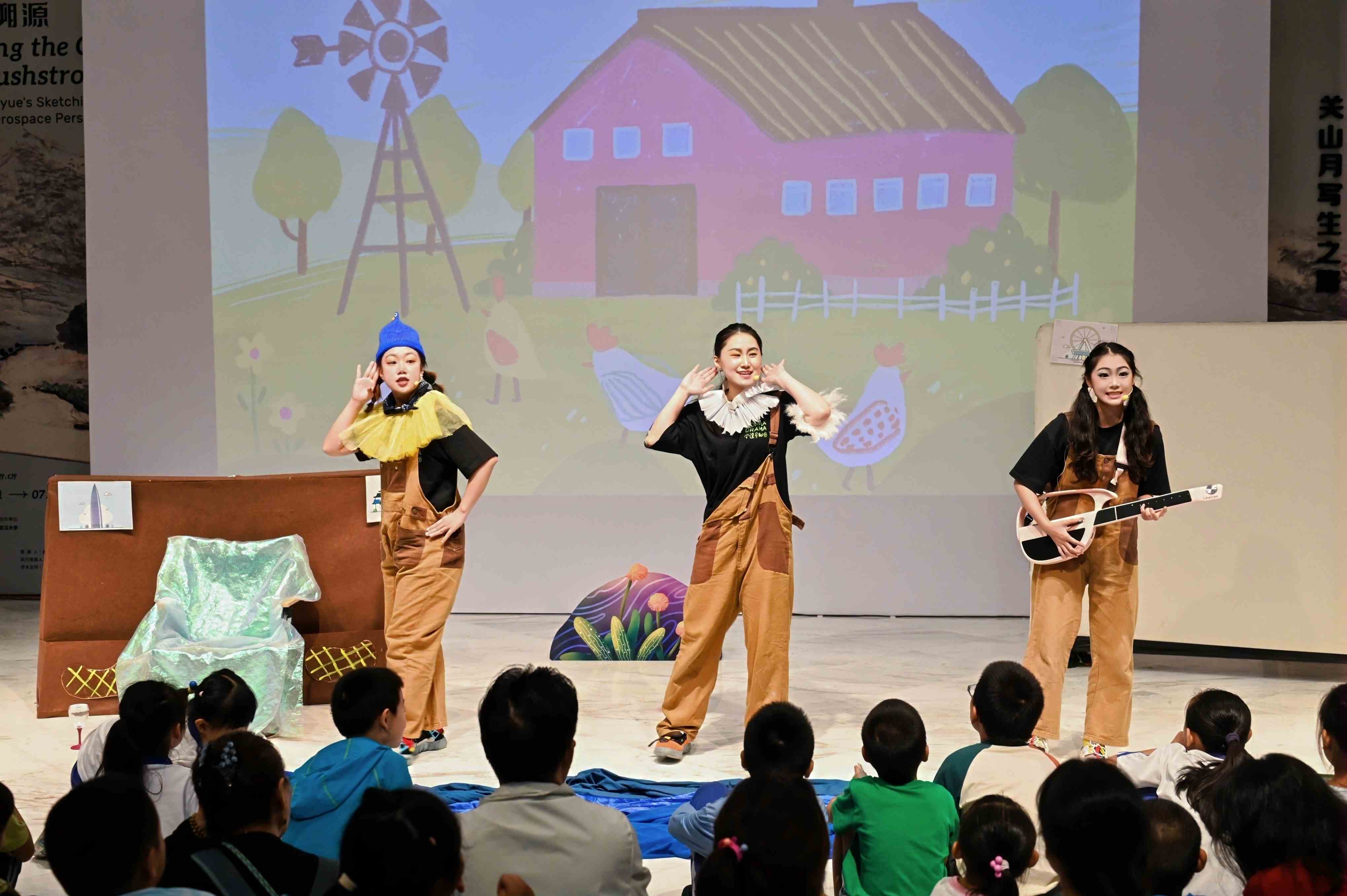 劇團演員即興增加的台詞引導孩子們走進展廳,融入戲劇情節的同時,也融入展覽情景。展廳入口,小觀眾們跟隨小雞小蘭的足跡,在跌宕情節中感受「生活比下蛋更好玩」的成長哲思;展廳之內,關山月美術館的經典藏品展區化作天然幕布,「筆跡溯源——空天視角下的關山月寫生之路」展覽與戲劇主題遙相呼應——藝術家丈量山河的腳步,與小雞奔赴星辰大海的勇氣,在展廳交織成關於探索與突破的雙重敘事。