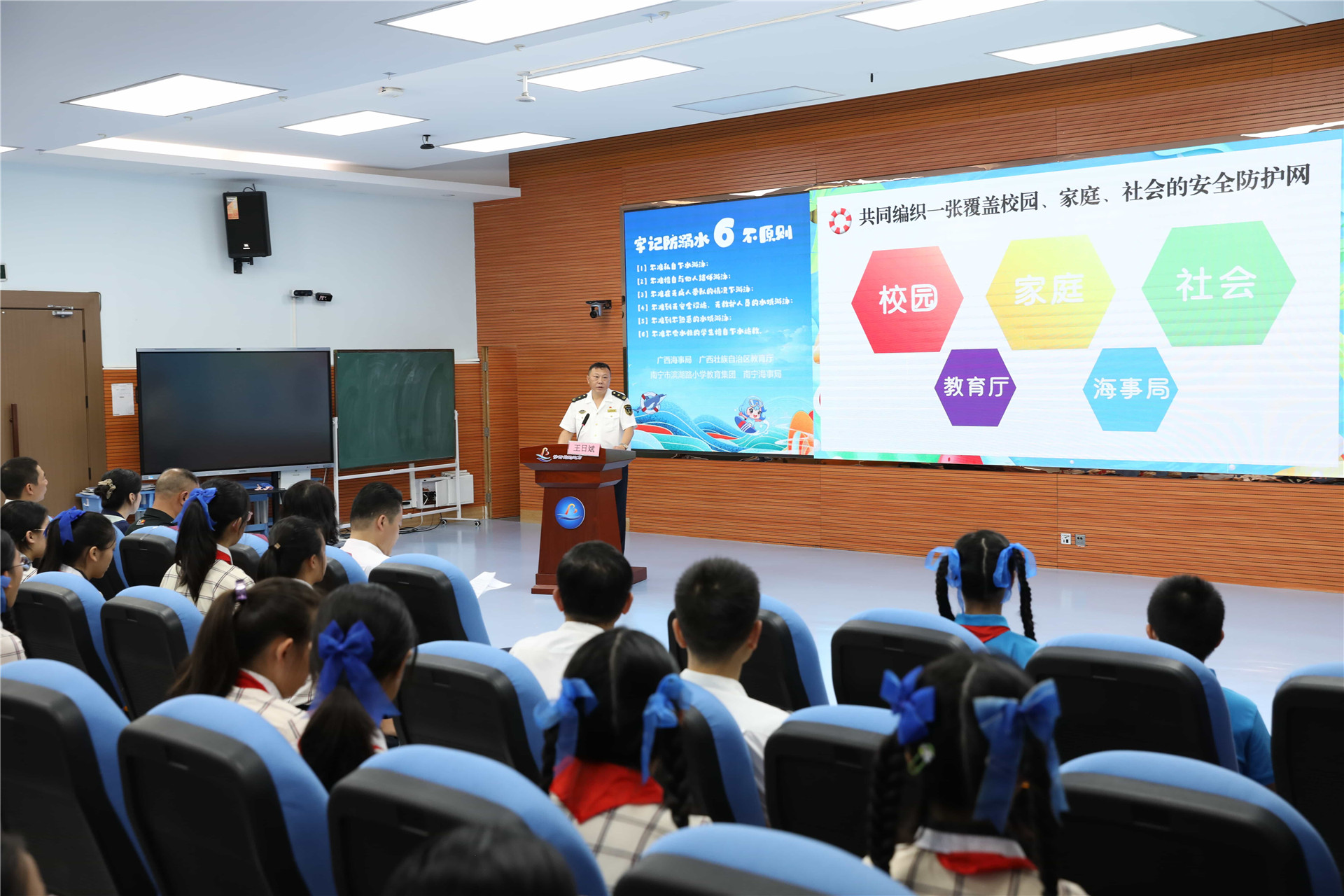 廣西壯族自治區教育廳安穩處一級調研員熊忠良在致辭中指出,溺水是青少年兒童死亡的「第一殺手」,隨着暑期臨近,防溺水教育刻不容緩。他強調,學校需落實「1530」安全教育機制,家長應強化「四知」監護責任,共同織密安全防護網。廣西海事局副局長王日斌則提出「讓安全知識成為守護生命的密碼」,他表示,作為自治區首家「少年海事學校」,南寧市濱湖路小學教育集團與海事部門攜手守護生命安全,正是「大手牽小手」的責任踐行。