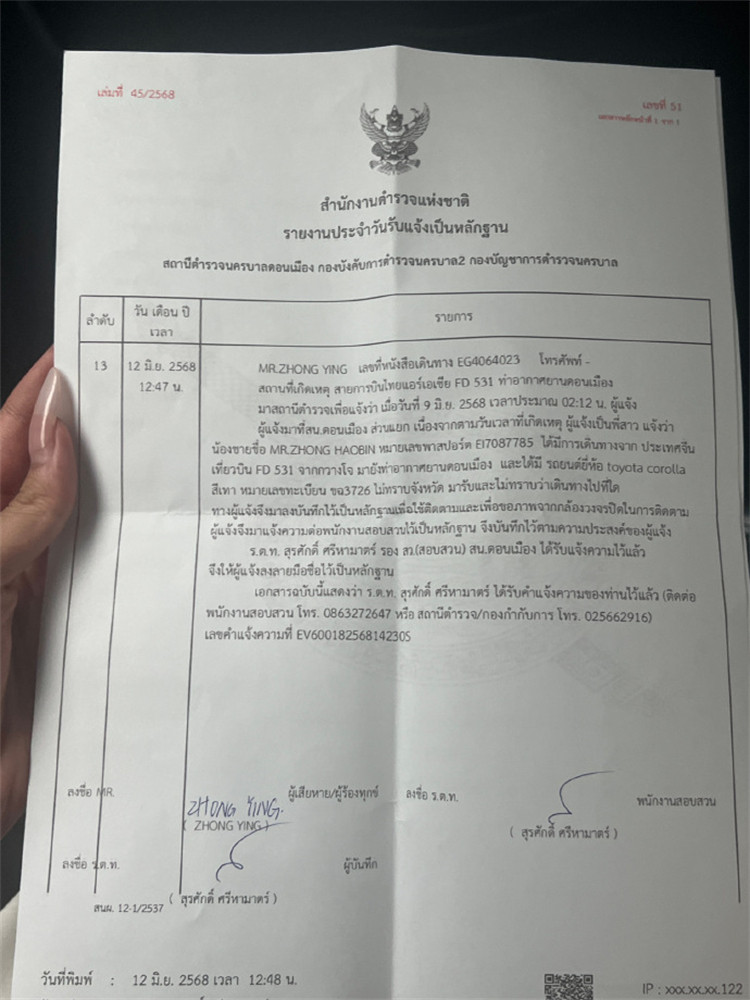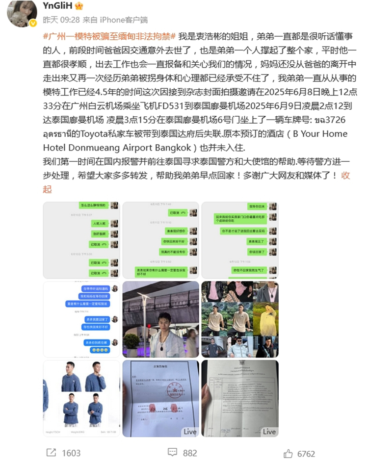一名衷姓女士在微博發文稱,其弟弟衷浩彬從事模特工作已經四年半,因接到雜誌封面拍攝邀請, 6月8日晚上12點33分在廣州白雲機場乘坐飛機FD531到泰國廊曼機場,2025年6月9日凌晨2點12到達泰國廊曼機場。凌晨3點15分,他在泰國廊曼機場6號門坐上了一輛車牌號: ขฉ3726 อุดรธานี的Toyota私家車,被帶到泰國達府後失聯,原本預訂的酒店(B Your Home Hotel Donmueang Airport Bangkok)也並未入住。