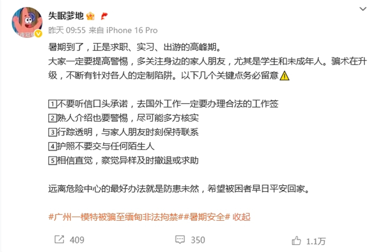 近幾個月來,全國各地都不乏有不幸被騙至東南亞等危險地帶的案例。小編也在此提醒各位注意人身安全,務必警惕「出國務工」類招聘,多查看保安局等相關機構宣傳信息。