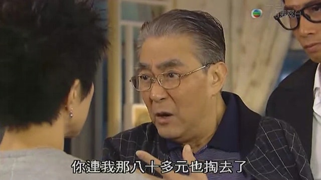 周驄在《溏心風暴之家好月圓》演「Sa姨」關菊英老竇,用湯勺敲她的頭,又叫她「攞婆」,是其代表作之一。(電視截圖)