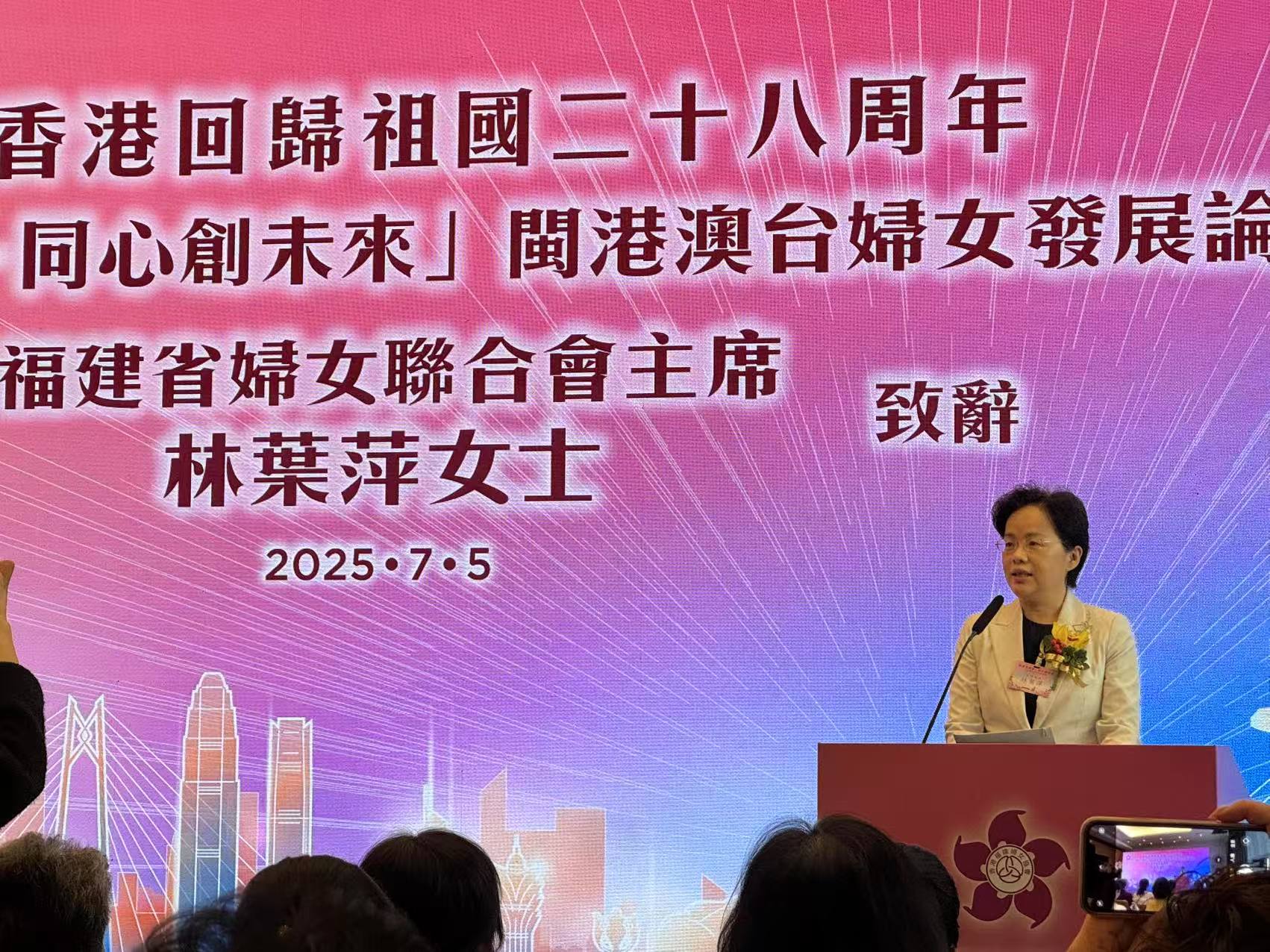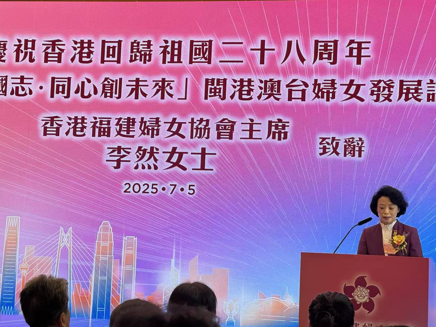 香港福建婦女協會為慶祝香港回歸祖國28周年,舉辦‘激昂巾幗志 同心創未來’閩港澳台婦女發展論壇,講述新時代女性的發展新動力。新任香港福建婦女協會主席李然致辭表示,主題論壇已連續舉辦三屆,每一屆都緊扣新時代女性發展的閃光足跡,期望為在座姐妹帶來啟迪。