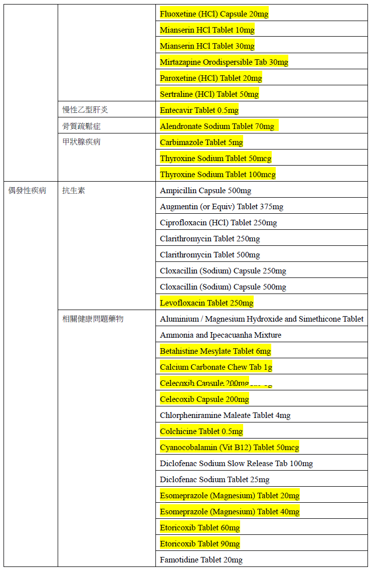 經檢視參加者的實際需求後,政府由8月1日起在基本藥物名單增添55項藥物,包括抗抑鬱藥、用於治療慢性乙型肝炎、骨質疏鬆症及甲狀腺疾病藥物。此外,名單亦增加更多針對與偶發性疾病相關健康問題的藥物,如紓緩哮喘和痛風、緩解噁心和眩暈的藥物。擴大後的名單所涵蓋的基本藥物總數會由原來的59項增加至114項,為家庭醫生提供更大彈性,以照顧參加者的臨床需求。最新的基本藥物名單詳見附件。