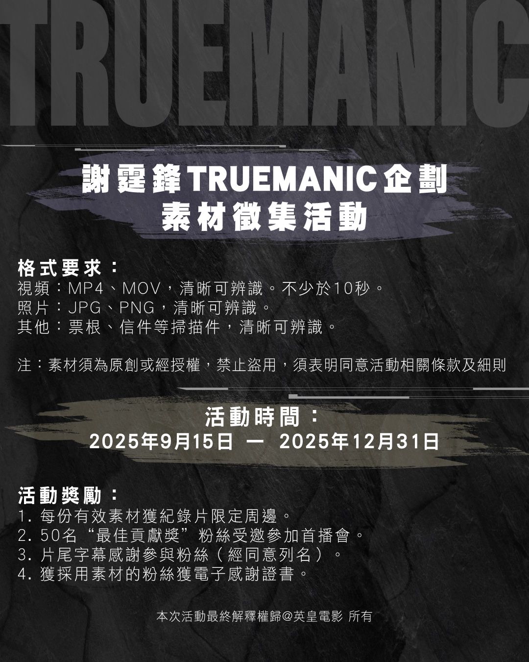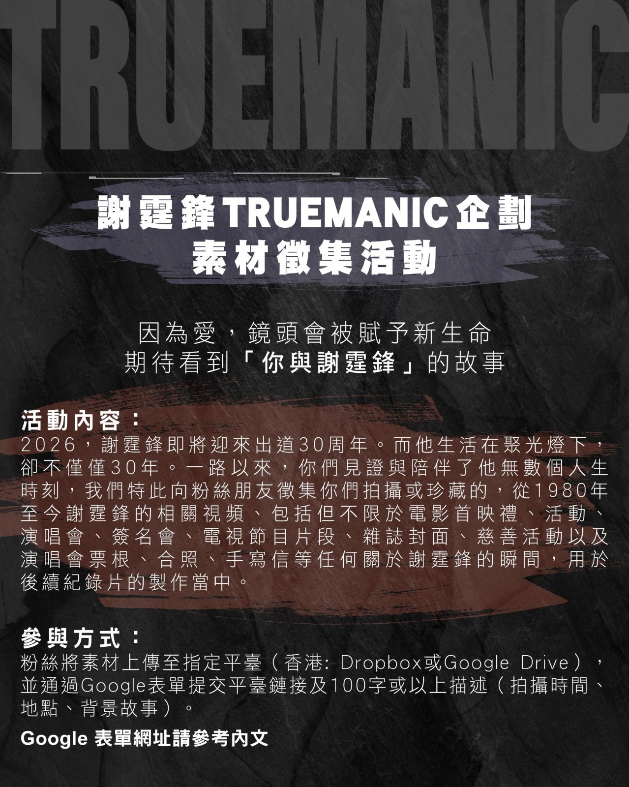 2026年是霆鋒即將迎來出道的30周年。宣傳短片中,謝霆鋒首次跟大家分享自己的小學成績表,霆鋒笑言:「可能我個樣爛仔咗少少,但係都幾多A㗎!」而成績表上那張稚嫩萌爆的小學證件照,也讓人忍不住想探究更多有關謝霆鋒的生活碎片。霆鋒提及,自己過往的45年很像一場真人Show,發起「Truemanic素材徵集活動」,來記錄自己曾經真實走過的日子,同時想通過這次機會讓粉絲道出潛藏已久的故事。素材徵集活動現正進行中。(張宏斌)