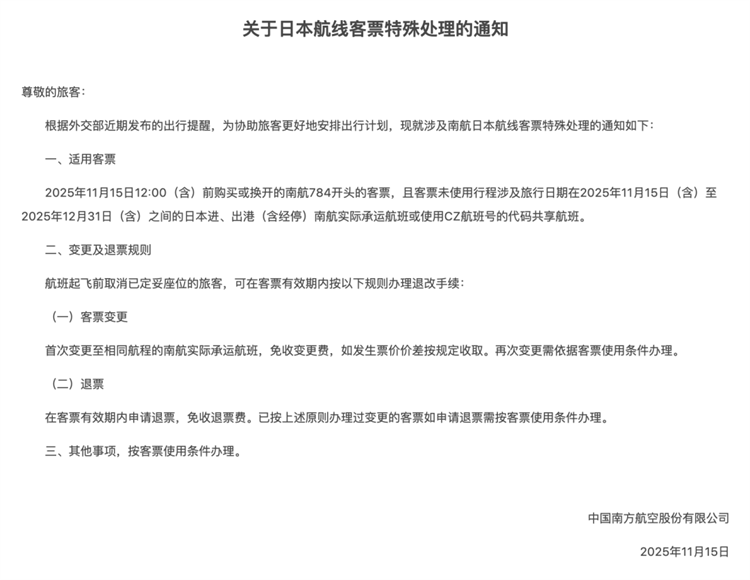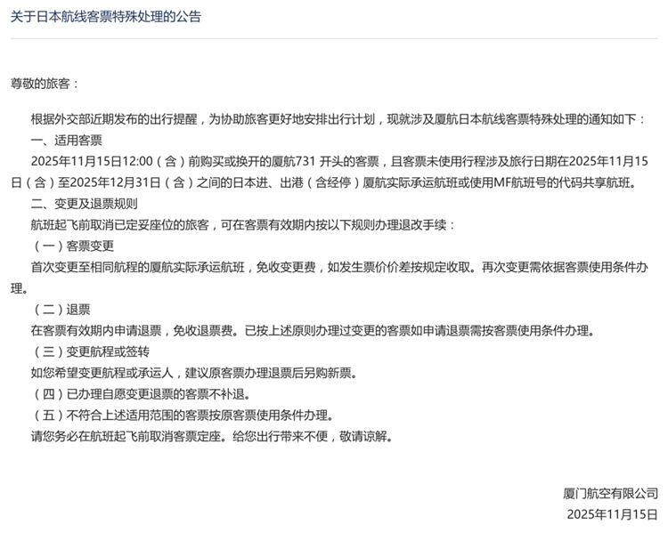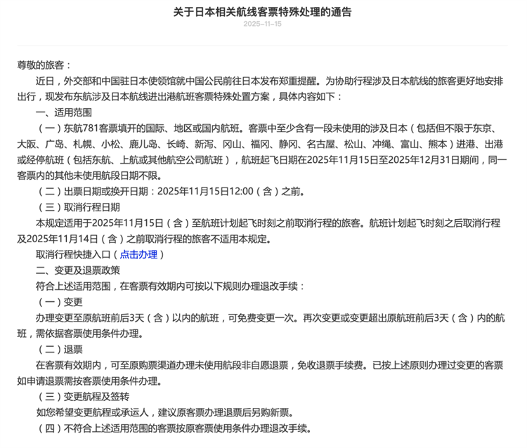 15日,國航、南航、東航、海航、川航、廈航等航司相繼發布通知,對於出行日期在12月31日之前,涉及日本相關航線且符合相關條件的客票,可予以免費退改處理。