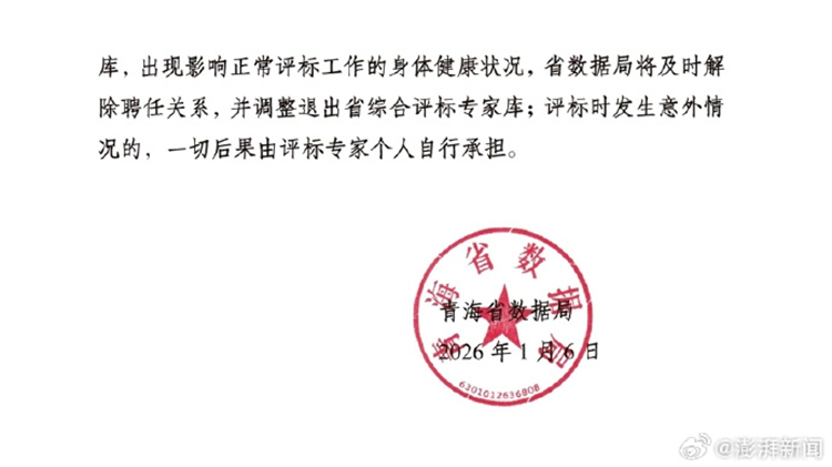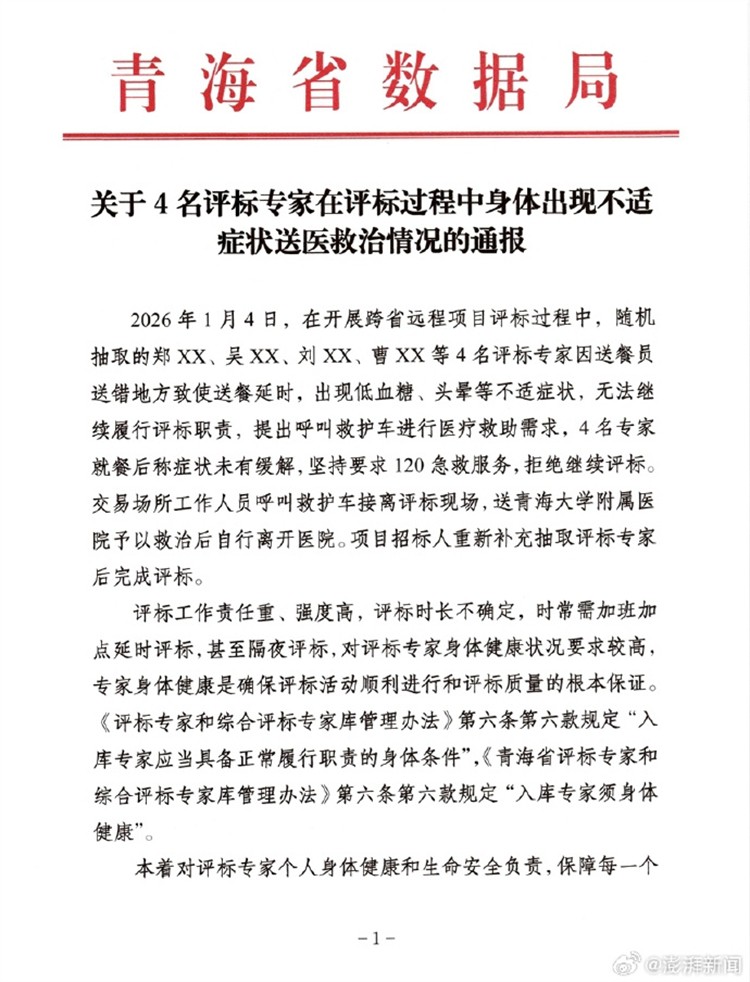 據「青海省公共資源交易網」1月12日消息,青海省數據局發布《關於4名評標專家在評標過程中身體出現不適症狀送醫救治情況的通報》,原文如下。