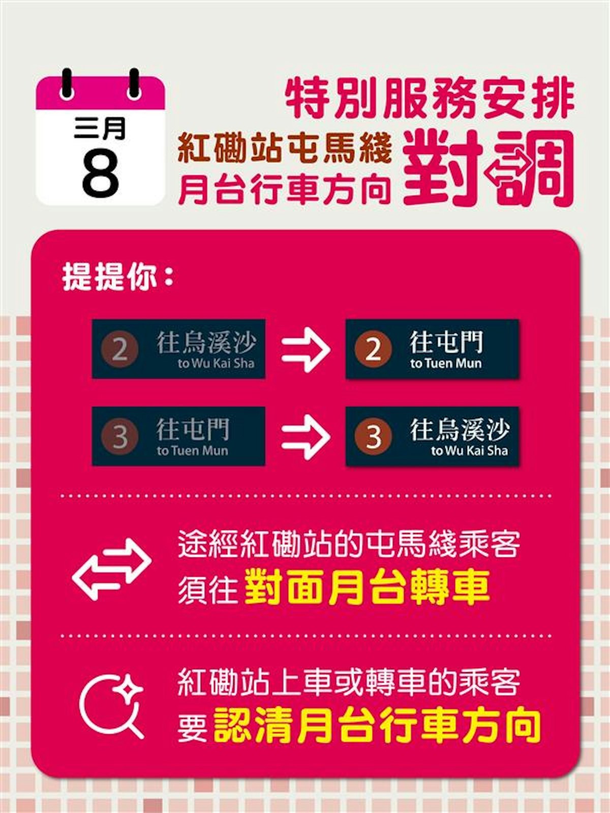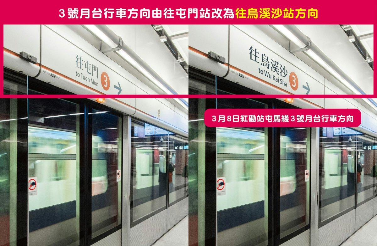 港鐵表示,今日紅磡站屯馬線月台的行車方向與平時對調,在紅磡站入閘乘搭屯馬線,或在紅磡站由東鐵線轉乘屯馬線的乘客,上車前請先留意月台的行車方向。
