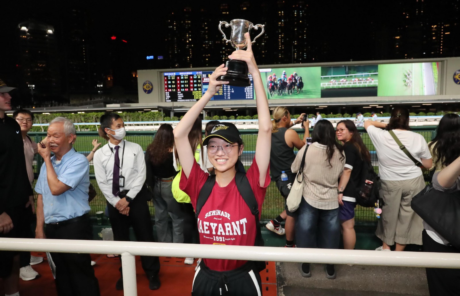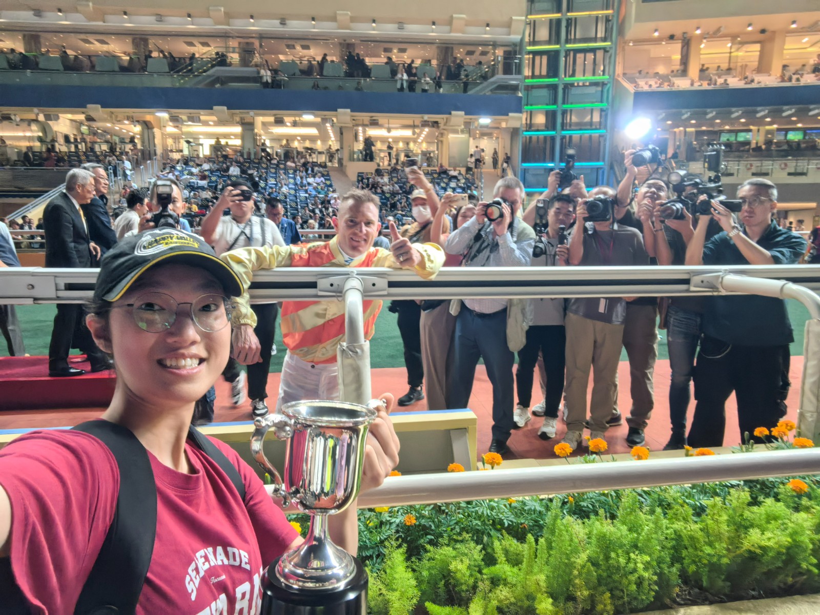 我們與女粉絲來個簡短訪問,女粉絲名叫Fiona,她表示:「可能因為我每次都來吧!我經常站在第一排,給他加油鼓掌,然後他可能慢慢就熟悉一點了,我沒想到會拿到獎盃,這是獎盃啊!」Fiona指出成為潘頓Fans,緣自喜歡「嘉應高昇」,她亦提到周日(26日)冠軍賽馬日將會繼續入場為潘頓及港隊打氣。
