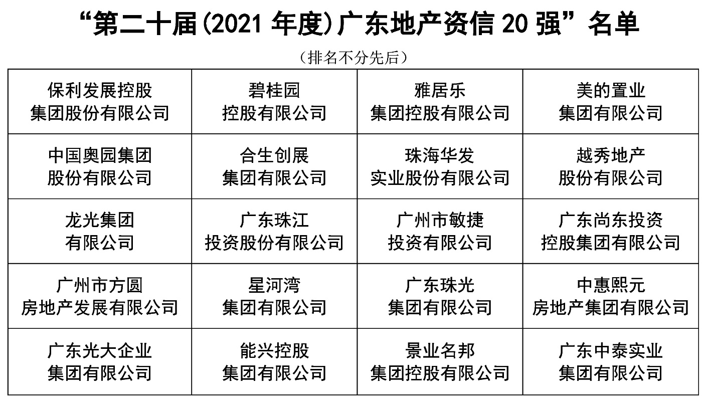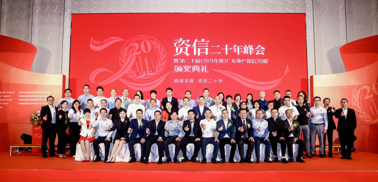 近日,工、農、中、建四大國有銀行廣東省分行、廣州分行,中地會等機構聯合公佈「第二十屆(2021年度)廣東地產資信20強」名單。據悉,廣東地產資信20強評審,自2001年開始到今年,整整二十年。