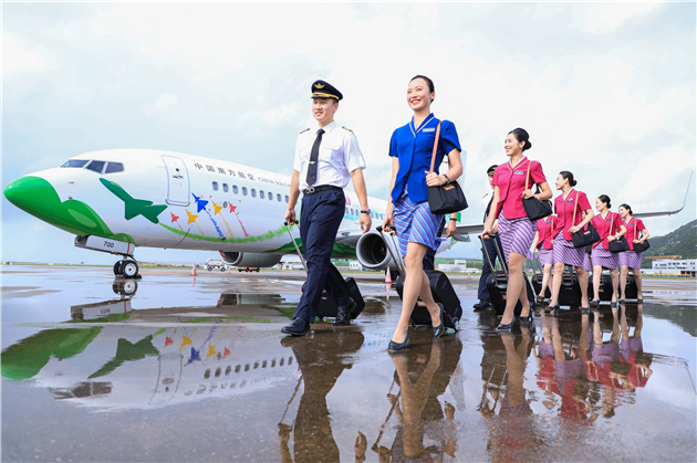 「青春珠海號」主題客機首飛前,機組人員進場準備