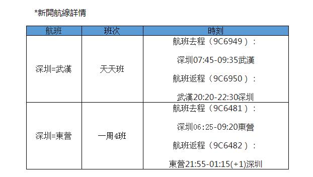 以上新航線機票已在春秋航空APP正式開售。開航初期,正值春秋航空深度折扣季,機票促銷、價格給力。據瞭解,深圳往返武漢單程399元起,低於高鐵票的票價,深圳往返東營單程369元起。機票價格隨市場需求即時變動,用戶可通過春秋航空APP即時查詢。春秋航空在深圳目前投放有過夜飛機7架。換季後,春秋航空在深圳的航線總量調整為23條。部分航線的航班時刻將會調整,例如,深圳飛鹽城的航班時刻將由原來的12:55(深圳)-15:30(鹽城)調至13:10(深圳)-15:30(鹽城),深圳飛長春的航班時刻將由原來的06:00(深圳)-11:15(長春)調至06:25(深圳)-11:50(長春)。更多有關航班時刻調整的資訊,可通過春秋航空APP即時查詢或注意通過短信形式發出的通知,合理安排出行時間。
