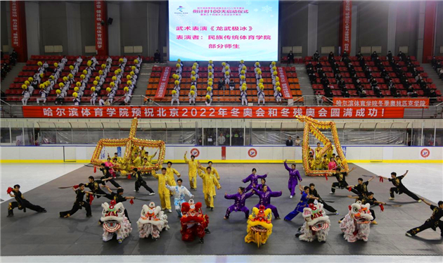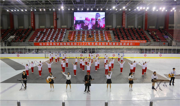 開幕儀式後,哈體師生奉獻了精彩絕倫的文藝演出,本次演出首次採用「冰陸結合」的方式,將陸上表演與冰上表演相結合,充分凸顯冬奧特色、展現冬奧元素。舞蹈、武術表演、歌伴舞、合唱等陸上文藝節目表達了全校師生對迎接北京2022年冬奧會的喜悅與期待,男子單人滑表演、隊列滑表演、冰上項目表演等特色節目為北京2022年冬奧會助力喝彩。