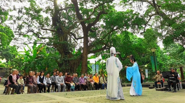 樹冠如蓋,盤根錯節,榕須倒垂,枝繁葉茂。這裏就是中堂鎮湛翠村的古榕公園,裏面有許多百年以上的古榕樹,還有秋楓、樟樹等各種名木古樹,如同一個天然氧吧。公園中間還有個修建了石凳的小舞台,兩旁各有一棵古榕樹守護着,村民不但可以在榕樹底下休閒健身,還可以在公園裏唱戲聽戲。美麗鄉村,或許應是此番景象。