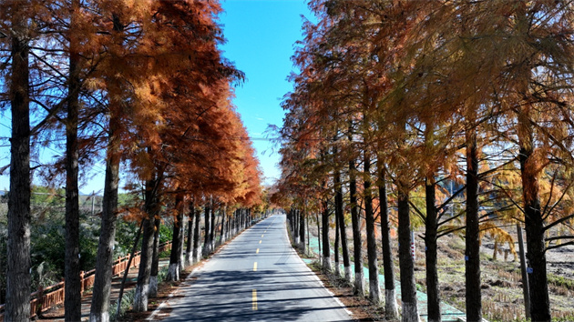 眼下這個季節,公路兩旁的落羽杉已經完成變裝,一片深紅,成為一道美麗的風景線。