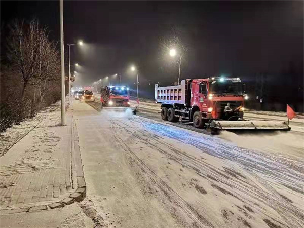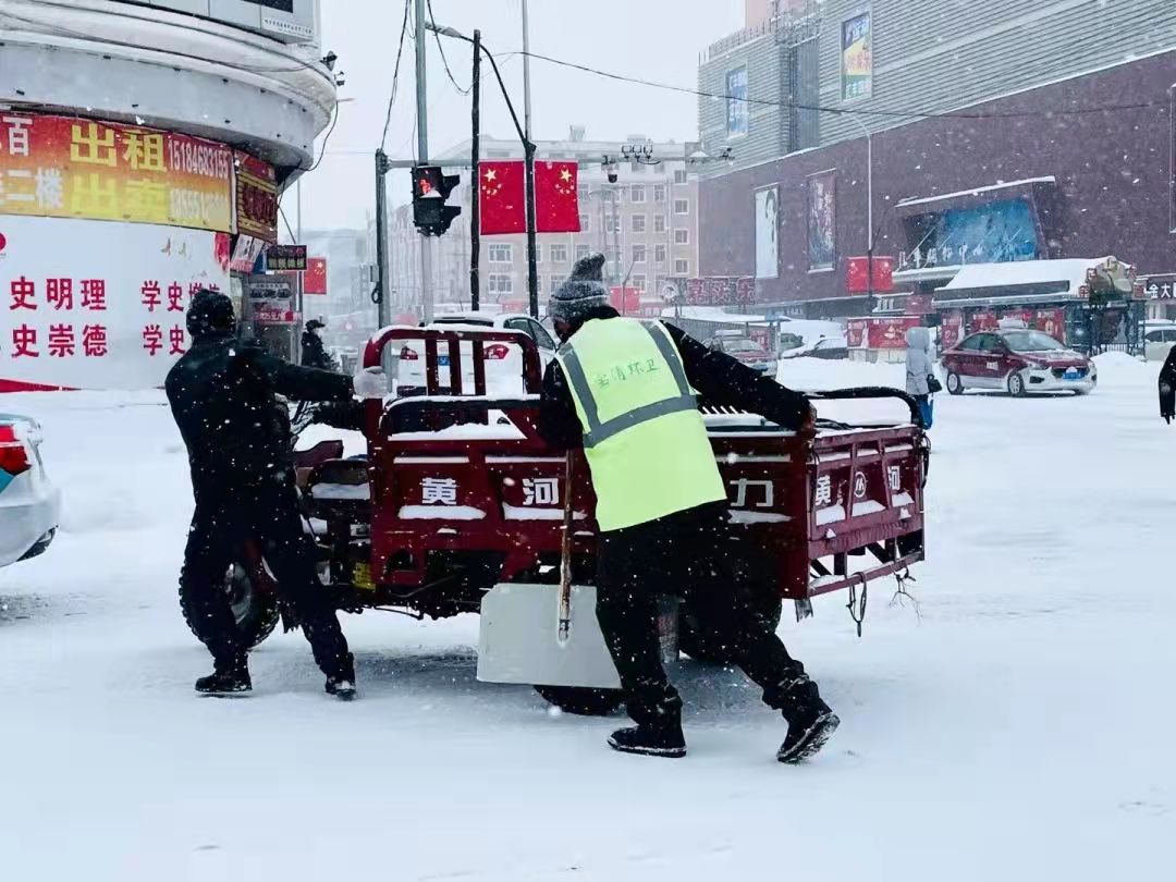 市容環境衛生服務中心環衛處副主任衣長海說:「我們環衛處以雪為令,共出動雪刷車10台、平地機3台、鏟車12台、清掃工人300餘人,到現在工人們沒有休息片刻。有的路段我們已經清理兩三遍了。現在仍在下雪,我們將繼續克服強降雪天氣的不利影響,持續進行清雪作業,全力保障道路暢通及群眾出行安全。」