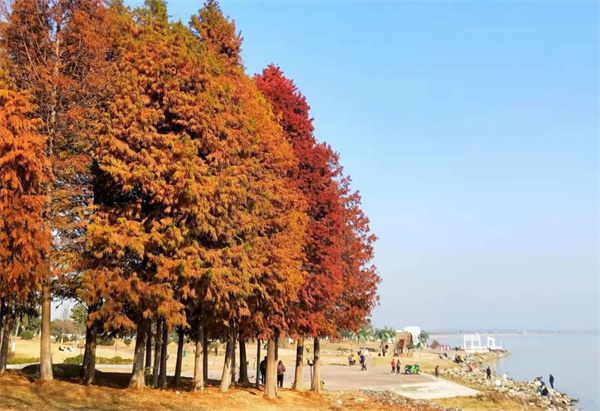 12月上旬,園內的小草、水杉、紅楓正悄然變色,與八百里巢湖相映成趣,讓人彷彿置身五彩斑斕的畫卷中。