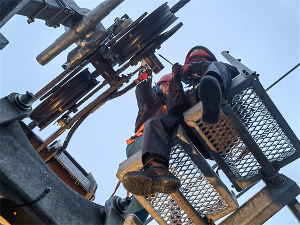 到達海拔1547米、位於風口處的15號支架時,洪鑫和饒鵬宇發現支架輪組結冰較為嚴重。洪鑫和饒鵬宇慢慢地往支架頂部攀爬,保險繩掛鉤掛在支架上時,發出“當當”的清脆響聲。洪鑫小心翼翼地攀爬上結滿亮晶晶冰層的支架,頂著呼嘯的山風,用螺絲刀仔細地敲擊、剷除輪組上的冰層,冰花四處飛濺。
