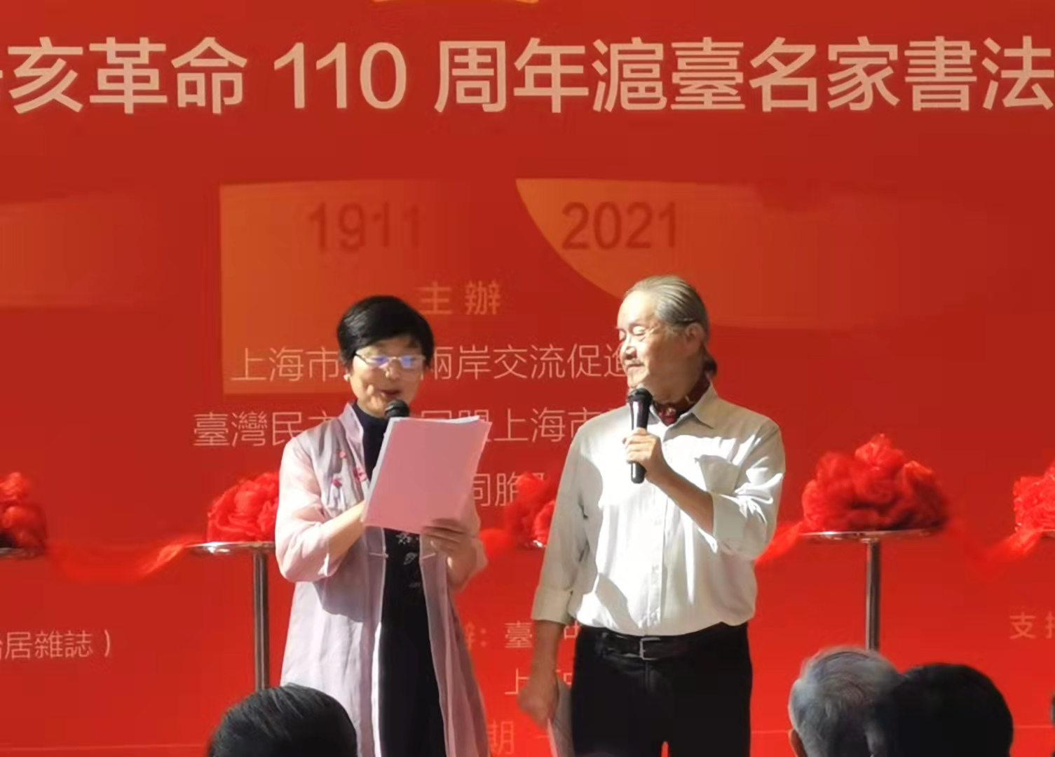 中華全國台灣同胞聯誼會原黨組書記、會長,原中共中央候補委員、全國人大常委、全國政協常委梁國揚,台灣新黨原主席郁慕明,上海市台辦主任鍾曉敏,台盟上海市委主委李碧影,上海市台辦副主任陽禮華,上海市政協文史委原常務副主任祝君波,上海市書法家協會主席丁申陽為開幕儀式剪綵,上海市海峽兩岸交流促進會會長李雷鳴宣佈書法展開幕。上海市台聯副會長廖志豪、台盟上海市委秘書長李海泳、上海中國書法院院長周志高致辭,台灣中國書法學會理事長陳銘鏡視頻致辭。滬台兩地60餘名書法名家受邀出席開幕儀式。(記者 宋健)
