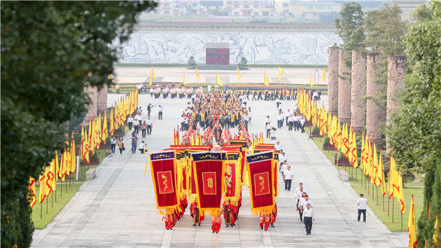 上午8時42分,祭祀隊伍隨引導儀仗隊,從闕門廣場出發,步入祭祀大道,依次經五穀圖騰柱、鷹鹿廣場、詠豐臺、朝覲廣場、龍珠橋、九鼎九簋,行至祭祀廣場,整齊列陣,靜候儀式開始。