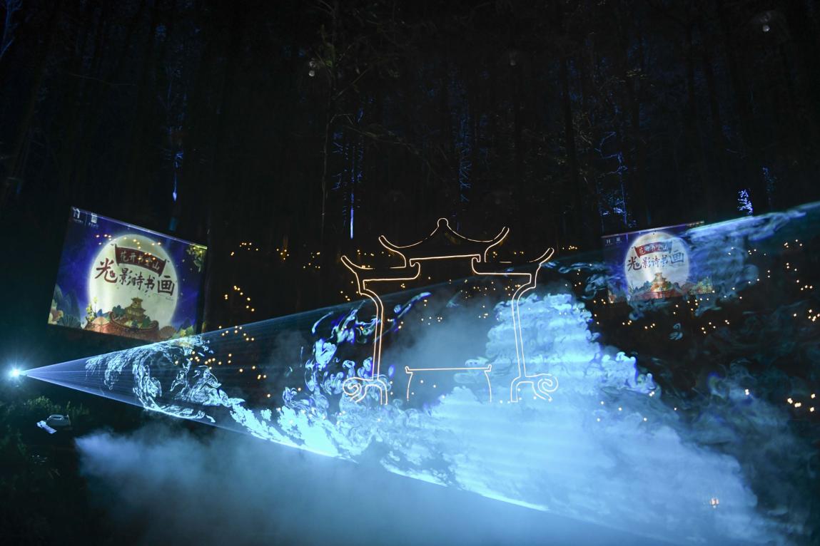 9月28日晚,在長沙湘江之畔、「楷聖」歐陽詢故里——書堂山歐陽詢文化產業園,全國首個森林5D全媒體行浸式幻彩光影秀《花開書堂山·光影詩書畫》迎來首秀。