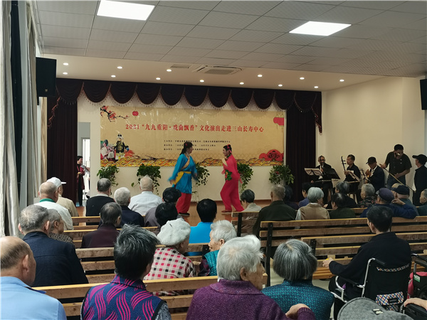 當天,在三山長壽中心寬敞明亮的一樓大廳內,廬劇《孟姜女》《遊春》輪番上場,黃梅戲選段《到底人間歡樂多》《小辭店》》《江姐》《海灘別》最受老人們歡迎。有的老人情不自禁地跟着一起吟唱;三山老年大學表演的《太極神韻》勾起了他們對過去生活的美好回憶,大家陶醉在中華傳統文化的魅力中。