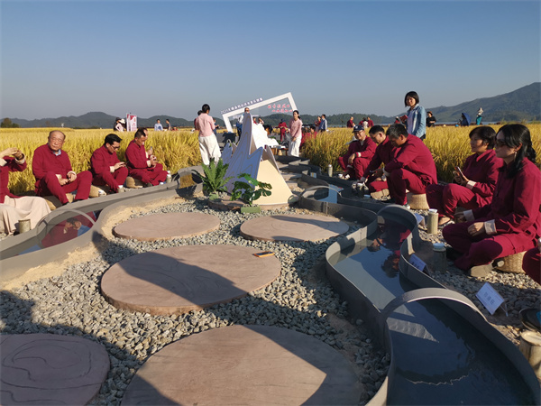 大沙鎮大塘面村金黃的稻浪中,清溪兩旁,席地而坐的人們,將盛了酒的觴放在溪中,由上游浮水徐徐而下,經過彎彎曲曲的溪流,觴在誰的面前打轉或停下,誰就得即興賦詩並飲酒。