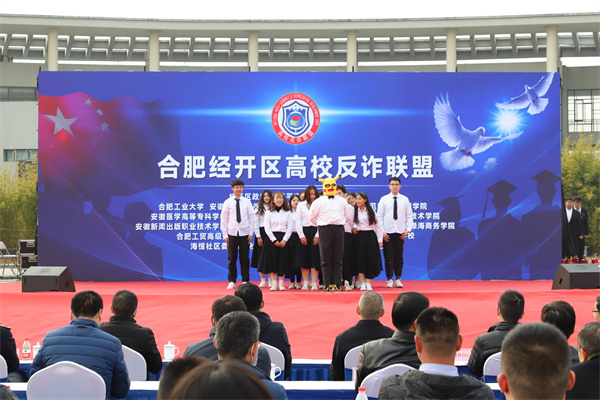 12月8日下午,合肥經開區高校反詐聯盟成立儀式暨反詐文藝演出在安徽大學磬苑校區舉行,這是全省首家區域性高校反詐聯盟。成立儀式上,安徽大學代表聯盟成員單位宣讀倡議書,17所高校結成反電詐聯盟。