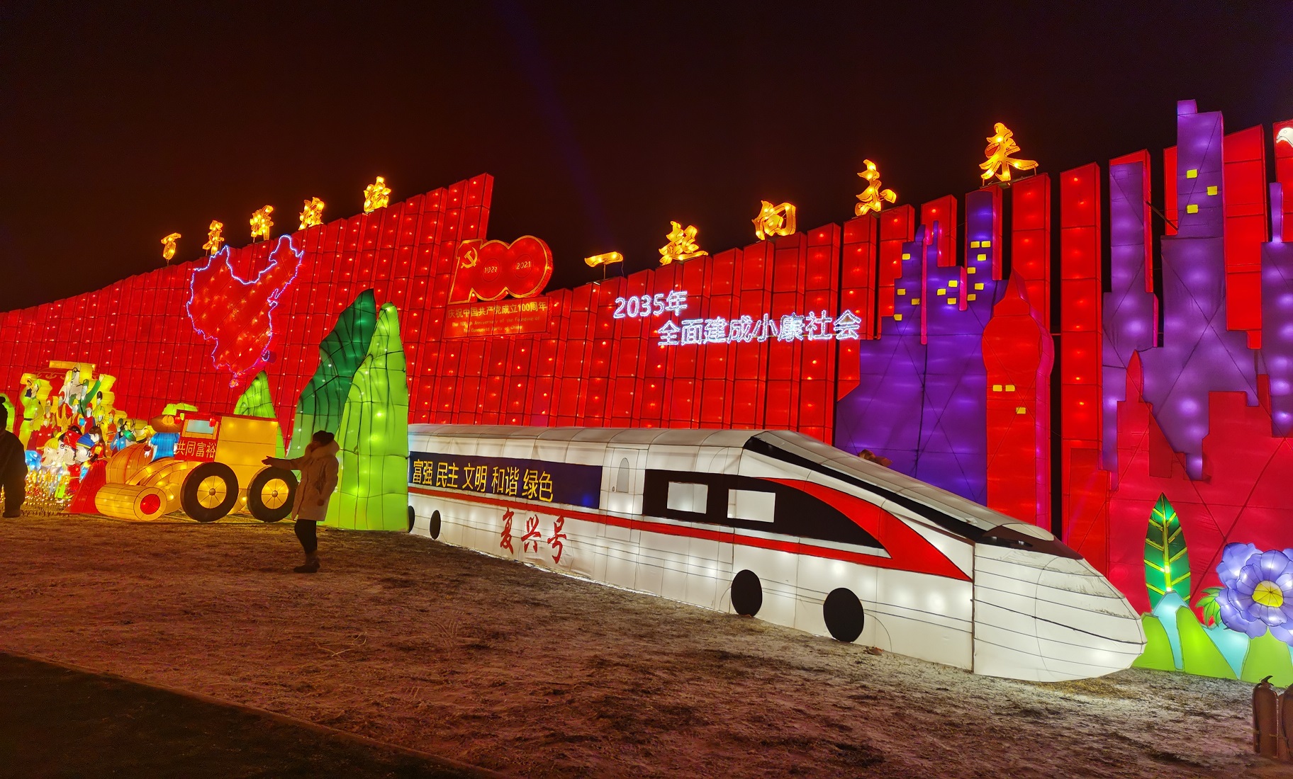 在現場大家會看到讓遊客沉浸其中的15萬平米的花燈, 「福臨天下」、「春滿華夏」、「我的大東北」、「共享盛世」、「一起向未來」五大主題燈組群逐次鋪展。百米長卷主題燈組《百年輝煌》,以恢弘的氣勢展現中國共產黨建黨100周年的風雨歷程和民生演進;生肖主題燈《虎虎生威》用傳統自貢工藝結合現代科技打造出威風凜凜,昂首闊步的虎王形象,拉滿新春氛圍,洋溢着喜慶吉祥;《國潮》京劇臉譜燈組,展現了承載中華歷史印記的三星堆文物造型和穆桂英掛帥的傳統京劇造型,並讓京劇臉譜帶上了現代的墨鏡,這種復古與時尚的碰撞,讓傳統花燈變得十分炫酷;《冰雪迷宮》花燈佔地3000平米,冰雪與花燈的結合讓人們體驗到獨具一格的東北冬日文化特色。