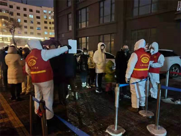 3月16日,在哈爾濱市全員核酸檢測中,記者看到香坊區香大街道白毛小區檢測點,來自哈爾濱交通集團公共交通有限公司的志願者身着志願者的紅色馬甲在緊張地忙碌着,他們在現場維持秩序、查驗雙碼、疏導人群,全力配合做好核酸檢測工作。