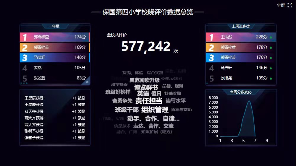 評價是學習質量的保障,在倡導學生自主學習的時代背景下,重視評價的過程性與互動性尤為重要。保國四校開發學生發展質量評價,全面考察學生品德發展、學業發展、身心健康、興趣特長,利用現代手段進行數據的採集和積累,以「評價報告」為載體,實現家長和學校協同育人;55中學校運用「希沃白板」增加課堂互動評價,利用「班級優化大師」全面點評學生課堂表現,採用「七天學堂」實現當堂檢測和作業的數據分析,針對問題利用希沃知識膠囊為學生提供個性化輔導;85中以信息技術為手段,通過挑戰式評價,引導式評價,鼓勵式評價,自評和他評相結合,形成「學習共同體」,隔空不隔愛,孩子們在雲端建起時空學堂,用心靈召喚彼此做最美的自己。