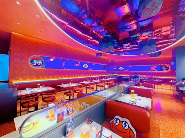 蛙來噠迎合當下年輕人審美的裝修風格,一直以來深受蛙粉們的喜愛,從1.0工業風到2.0霓虹幻彩風到3.0黑金風到4.0閃電風,每一種裝修風格都打入年輕人的心,成為城市網紅美食打卡地,而這次全新升級的5.0星球科技風,更是讓蛙粉們忍不住跑過來拍照打卡。