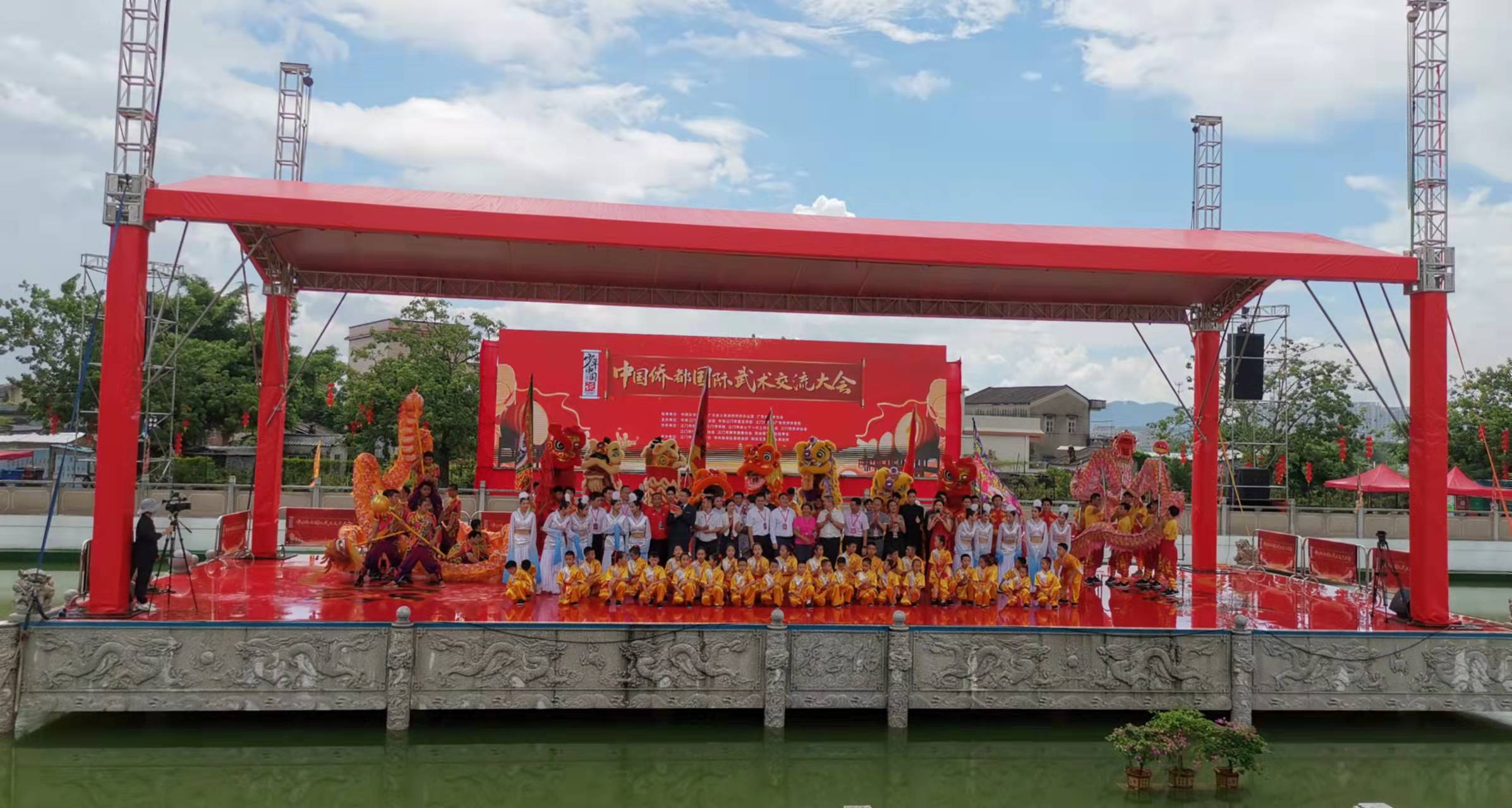 現場,9支海內外青少年武術代表隊130多名武術愛好者,分別展演了蔡李佛拳、詠春拳、佛家拳、武當拳、周家拳、洪拳、太極拳等拳術。此外,大會還邀請了美國、巴西、墨西哥、荷蘭等三十多個國家的武術愛好者、海外武術代表隊,上線「雲切磋」,為海內外武術愛好者搭建了一個中華武術文化學習交流平台。而主舞台設立在京梅村中央水上舞台,大大增強了舞台美感和國際武術交流的觀賞性。