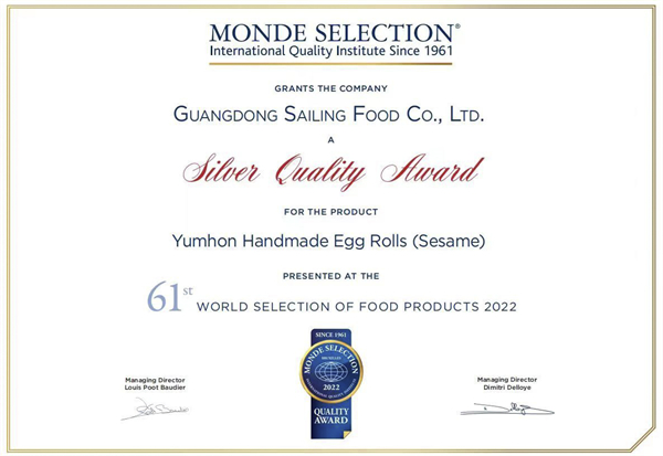 在2022年的Monde Selection世界食品品質評鑑大會上,來自90多個國家的3000多件產品參與是次評選,全球的80餘位專家通過完全獨立的方式,對參評產品進行360度的質量評估,廣東揚航食品有限公司的手工蛋卷,獲得了由專業評審團授予的銀獎。