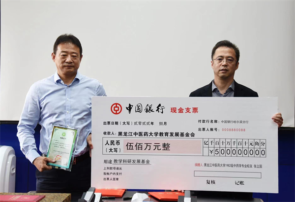 8月29日,哈爾濱敷爾佳科技股份有限公司董事長、總經理,黑龍江省工商聯副主席、哈爾濱市工商聯副主席、哈爾濱市人大代表,學校1982級中藥學專業校友張立國向學校捐贈教育教學發展基金500萬元。黑龍江中醫藥大學黨委副書記、校長郭宏偉,黨委副書記、工會主席喬廣霞,黨委常委、副校長楊炳友出席捐贈儀式。