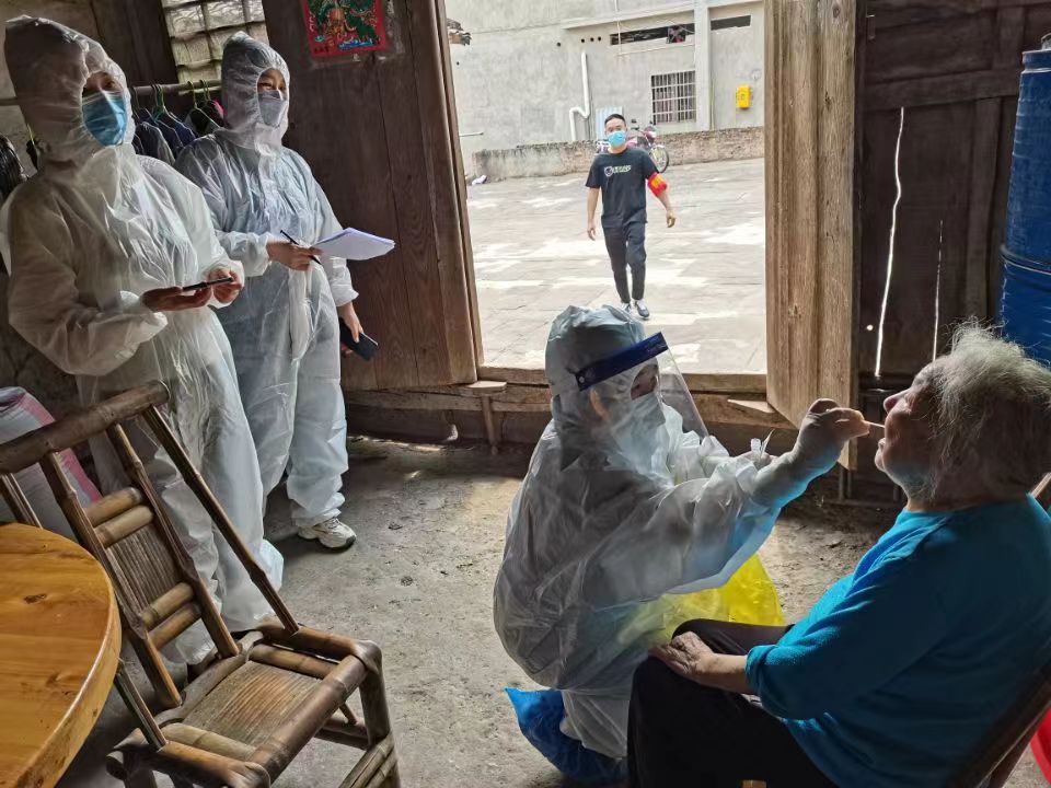 頂圖:教師等志願者上門入戶為村民核酸檢測