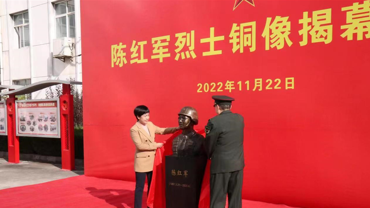 22日,衛國戍邊英雄陳紅軍烈士銅像揭幕儀式在甘肅省兩當縣舉行。在雄壯的國歌聲中儀式啟動,隴南軍分區政委王仁富和兩當縣政府縣長武冰為銅像揭幕。