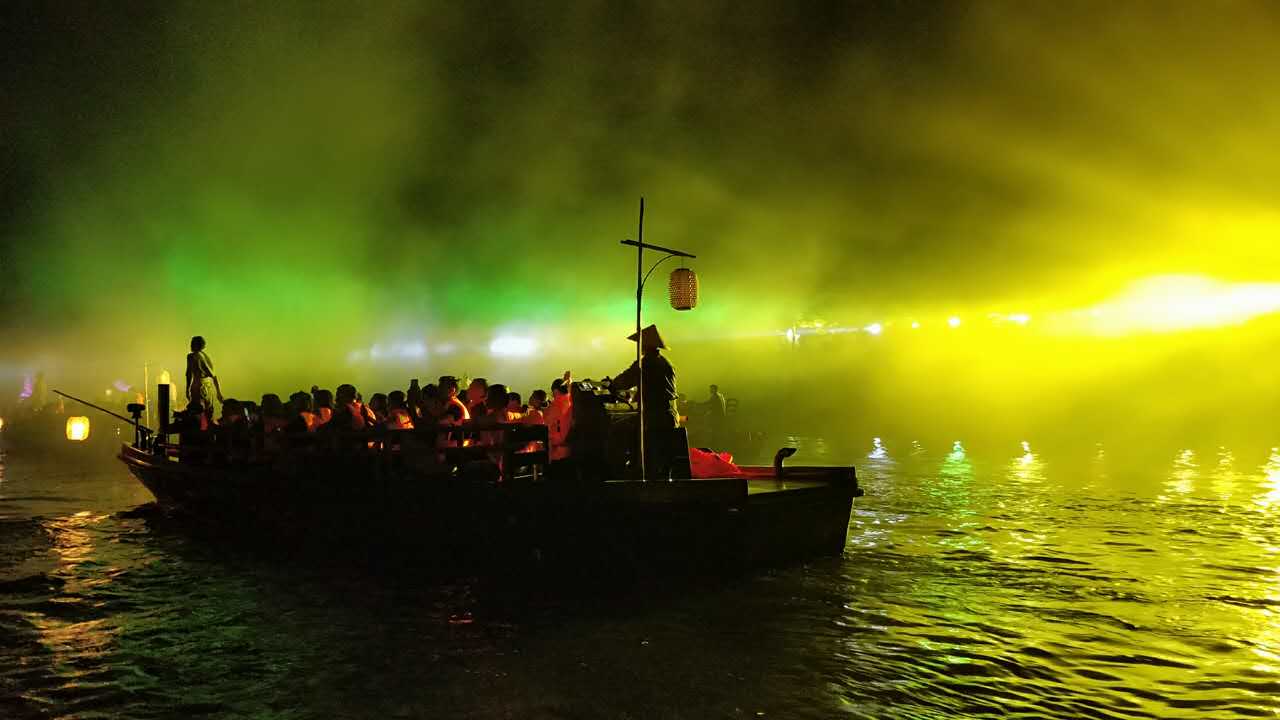 整個演出以秦溪下游的五柳碼頭為起點,溯秦溪而上,開啟“桃花源”的尋夢之旅。遊人在人聲喧語中上船,在遊船行進間漸漸遠離都市紛繁。船行前方是疊陵幽谷,耳畔是溪水悠悠之聲、漁網入水嘩嘩之聲,漁歌高腔與之應和回檔,身於船,心入桃源