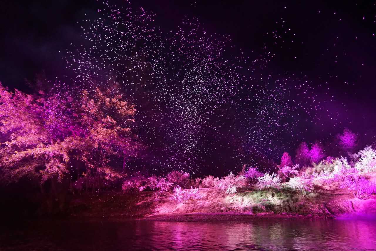 八十米連綿著一百多人的送嫁隊伍,水上婚禮通紅的喜慶倒映在碧綠的水面,仿若美好的愛情行走在山間、行走在水間。擂茶屋舍燈火通明,細聽鄰里鄉間說不完的趣事。一道河灣,一池清泉,此間的少女,在月光與林泉中濯淨世間污濁……當觀眾還在為一幕幕詩畫般的場景流連時,河邊的巨石被光影鐫刻出亙古流傳的千古文章,老漢、老嫗、少女、少年、孩童踏著河岸蘭汀緩緩誦讀《桃花源記》,充滿桃花源鄉音的合誦,用聲音刻下經典;林盡水源,遇見漫天花雨,又一次,遇見桃花小妹,她與這落英融為一體,主題曲《山邊水邊》的旋律在“桃花雨”,遊人忽覺是幾生幾世之前,見過這片十裡桃花……