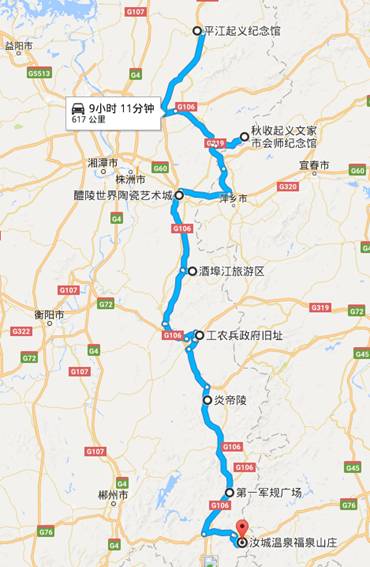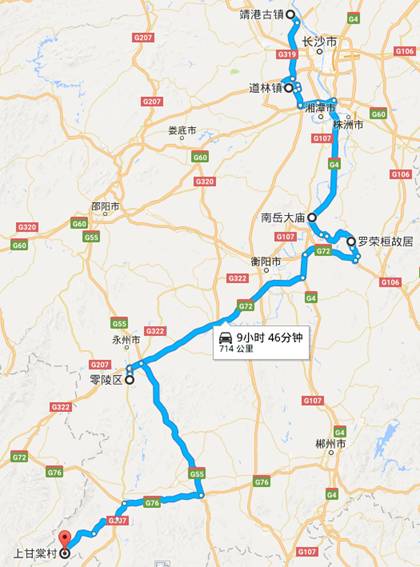 望城(湘江古鎮群)——【57分鐘(62.5公里)道林收費站】寧鄉(道林古鎮)——【1小時 41分鐘(137公里)南嶽收費站】——南嶽——【1小時 11分鐘(45.7公里)】——衡東(羅榮桓故居)——【2小時 43分鐘(223公里)永州收費站】——永州(零陵古城)——【3小時 14分鐘(246公里)道州南收費站】——江永(上甘棠村)
